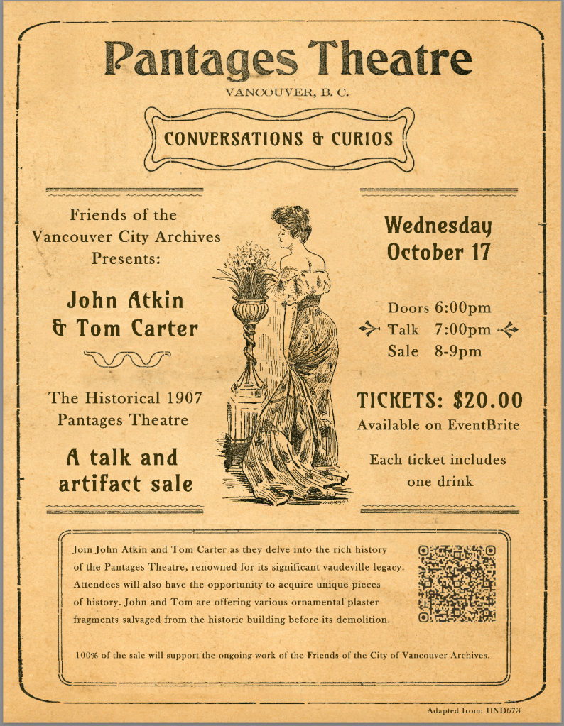 The event was a success with many of the Pantages Artifacts sold on the evening. 100% of the sales go to support the ongoing work of the Friends of the City of Vancouver Archives.